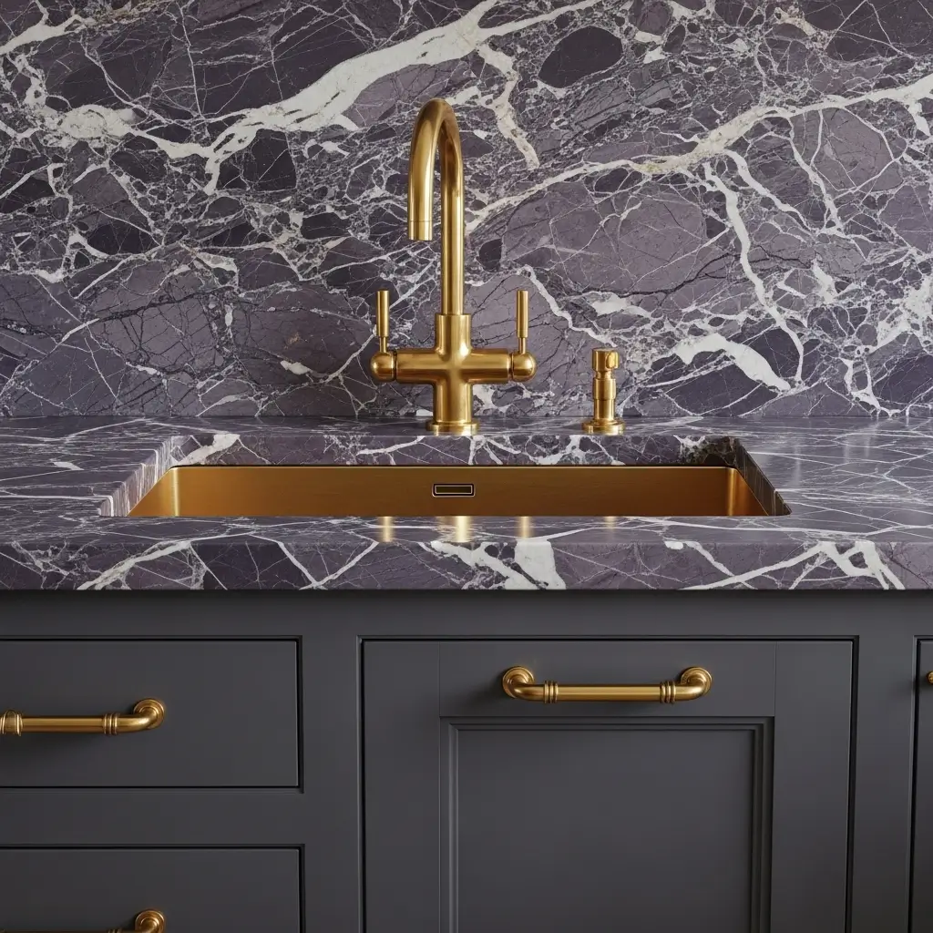 The deep purple and grey tones in Calacatta Viola are naturally complemented by warm metallic finishes.