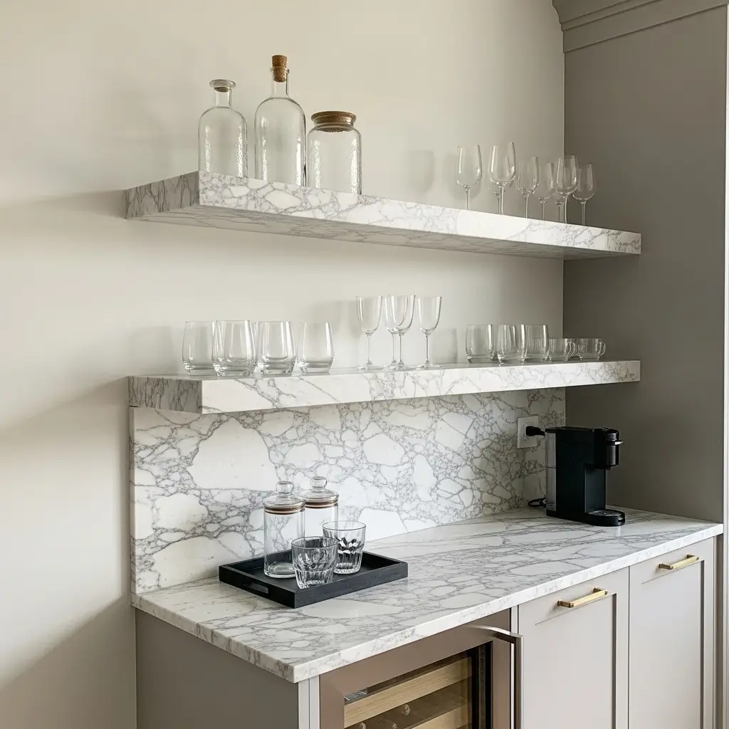 Take the inspiration beyond the counters by installing floating shelves made from Calacatta Viola off-cuts.