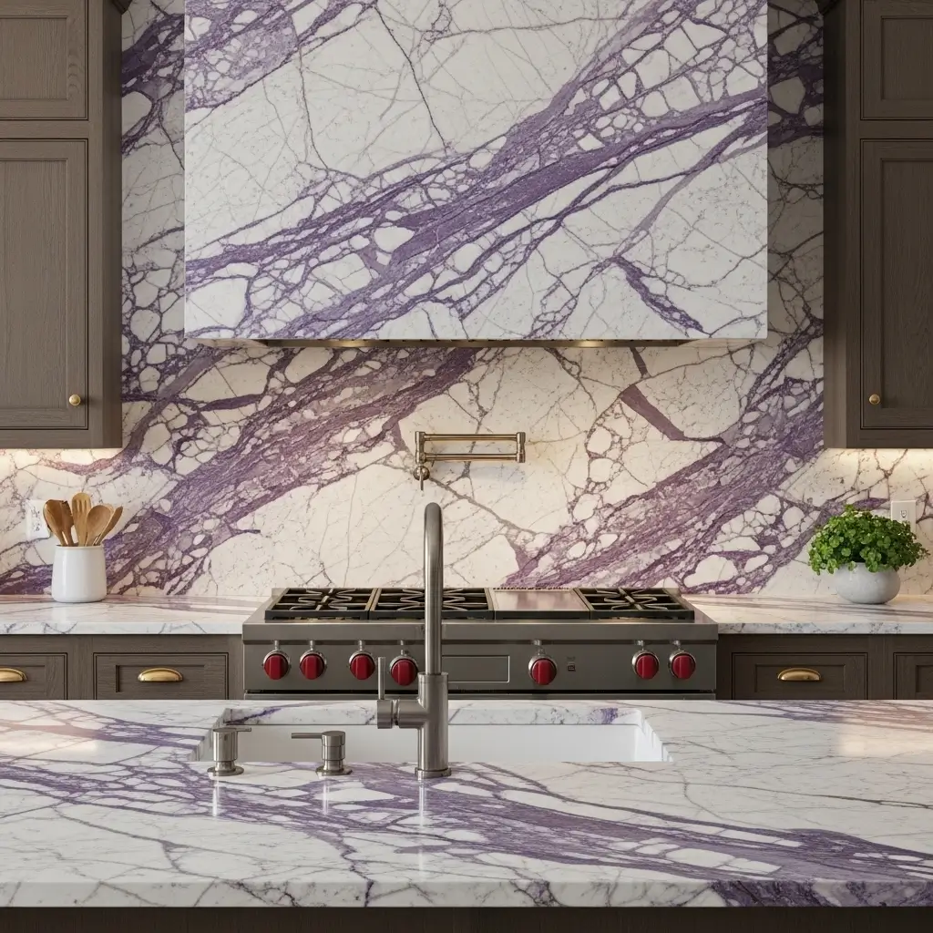 This striking natural stone instantly draws attention, blending creamy whites with dramatic purple tones to create a one-of-a-kind focal point in any kitchen.