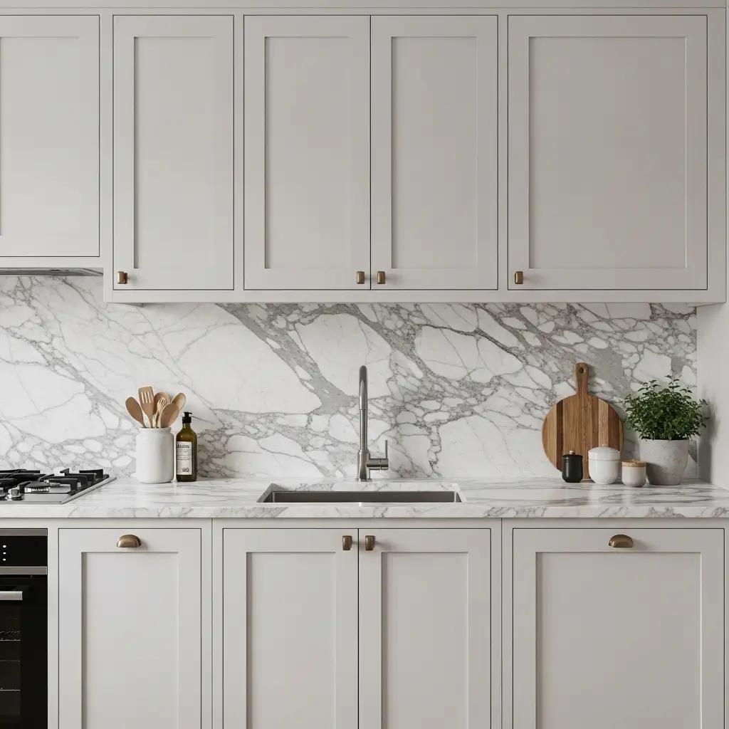 If you want the marble to be the absolute star of the show, pair it with simple, flat-panel or Shaker cabinets in a neutral white or cream.