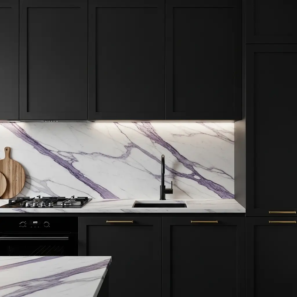 For those who love a dramatic, nocturnal aesthetic, pairing Calacatta Viola with matte black cabinets is a daring but rewarding choice.