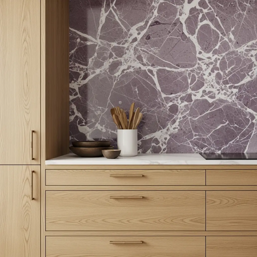It is most effective on large feature walls or massive kitchen islands. By aligning the purple veins perfectly, you create a sense of intentionality and high-level craftsmanship.