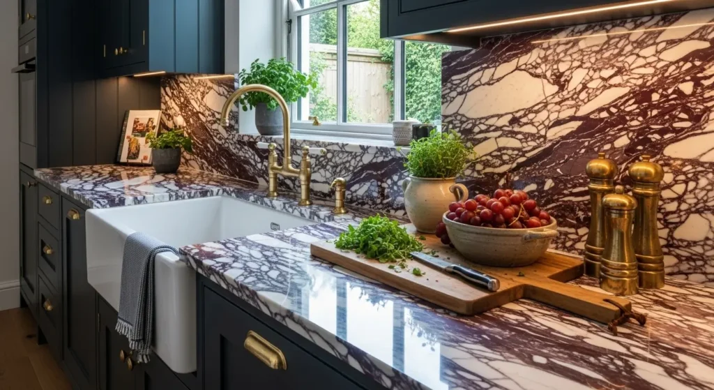 The dramatic purple veining acts as a natural mural behind your stove or sink, reducing the need for additional wall decor.