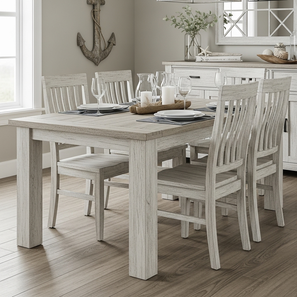 The centerpiece of any coastal dining room should be a table that feels like it has a story to tell. Opt for a solid wood table featuring a whitewashed or weathered oak finish, which instantly evokes the feeling of driftwood found on a morning beach walk.