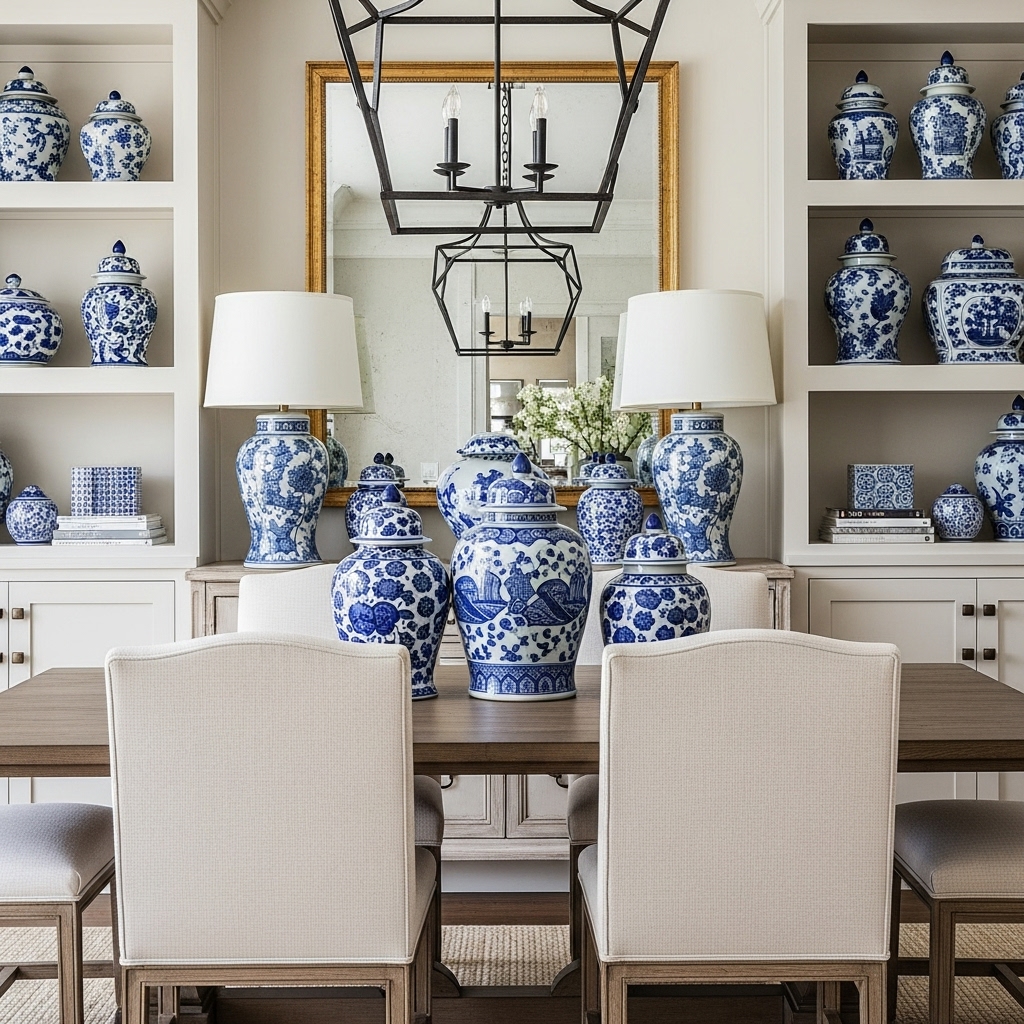 Introduce a touch of classic sophistication by displaying blue and white porcelain ginger jars or vases. You can group these on a sideboard, place them in the center of the dining table, or arrange them on open shelves.
