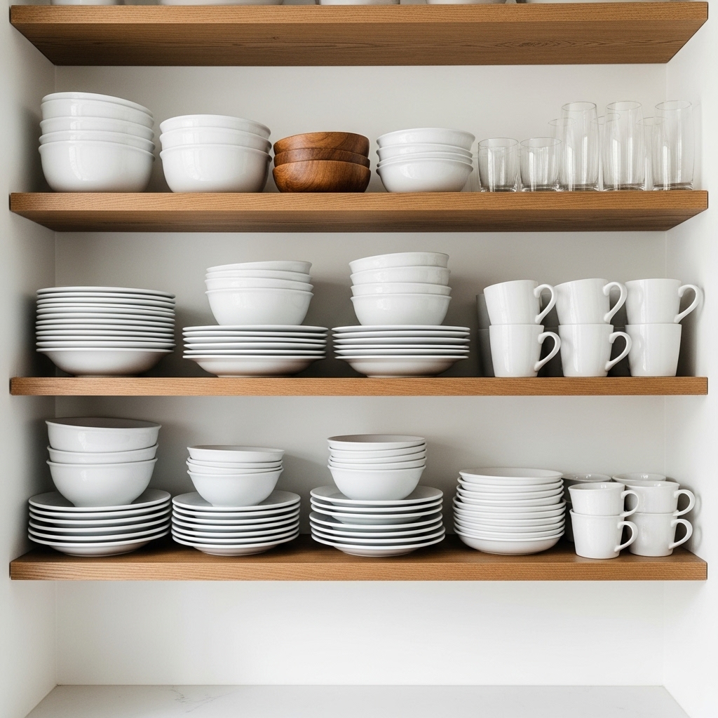 The repetition of white ceramics creates a calming visual rhythm and showcases the beauty of everyday objects. You can intersperse the dishes with small wooden bowls or clear glassware to add depth, turning your functional tableware into a charming part of the room’s design.