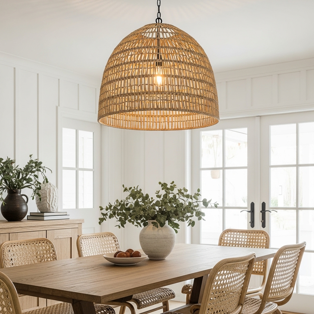 A large, basket-style pendant light adds a crucial layer of texture overhead, drawing the eye up and warming the cool white tones of the room. The filtered light that shines through the weave creates a cozy, intimate ambiance in the evenings, perfect for dinner parties.