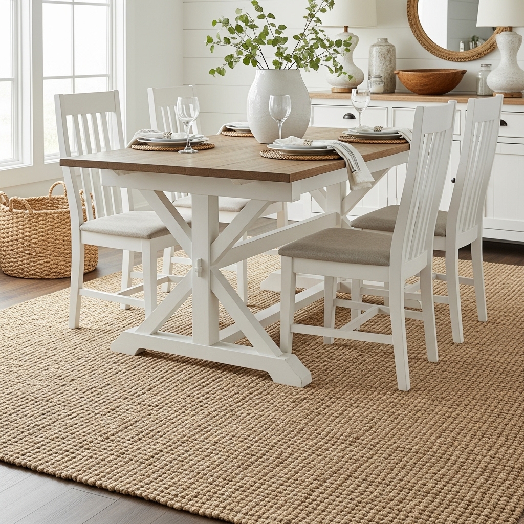 Ground your dining space with a large, natural fiber rug made from jute, sisal, or seagrass. These materials are quintessential to the look, offering a sandy, neutral base that complements white furniture and wood tones beautifully.