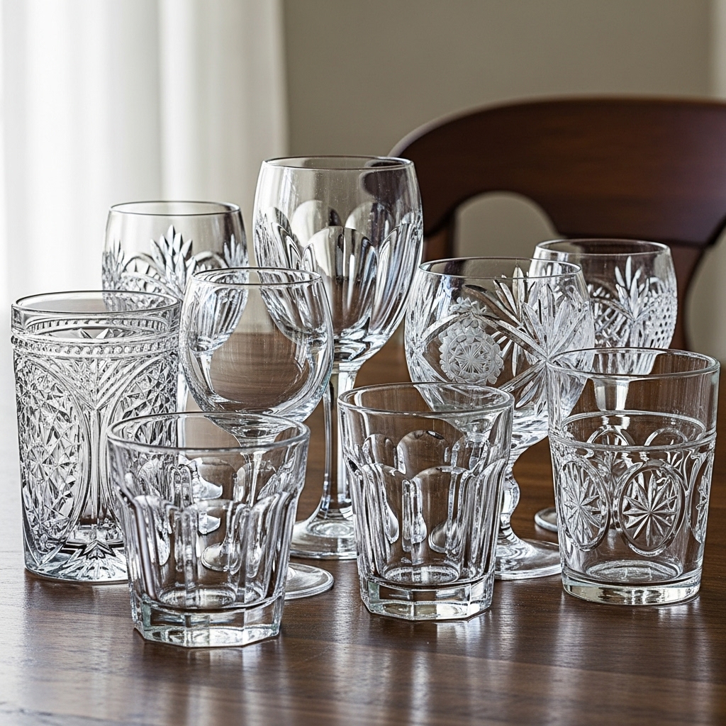 Avoid the uniformity of a brand-new box set of glasses and instead curate a collection of mismatched vintage glassware. Look for pressed glass goblets, etched wine glasses, or heavy tumblers in varying shapes and heights.