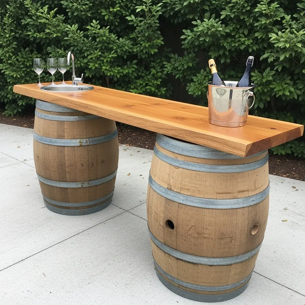 For a unique touch, install a small sink or an ice bucket into the top of one barrel.