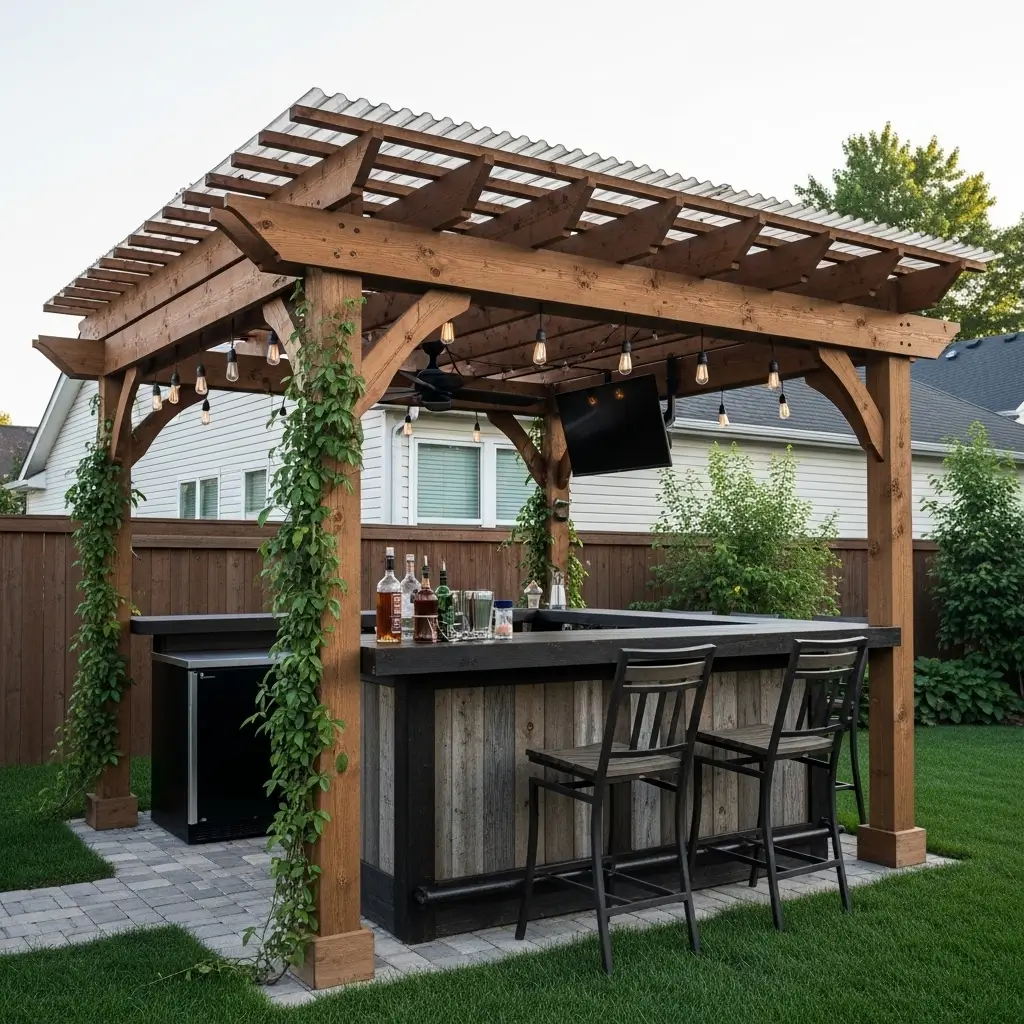 Building a bar under a small pergola provides shade and a sense of “room” in your backyard.