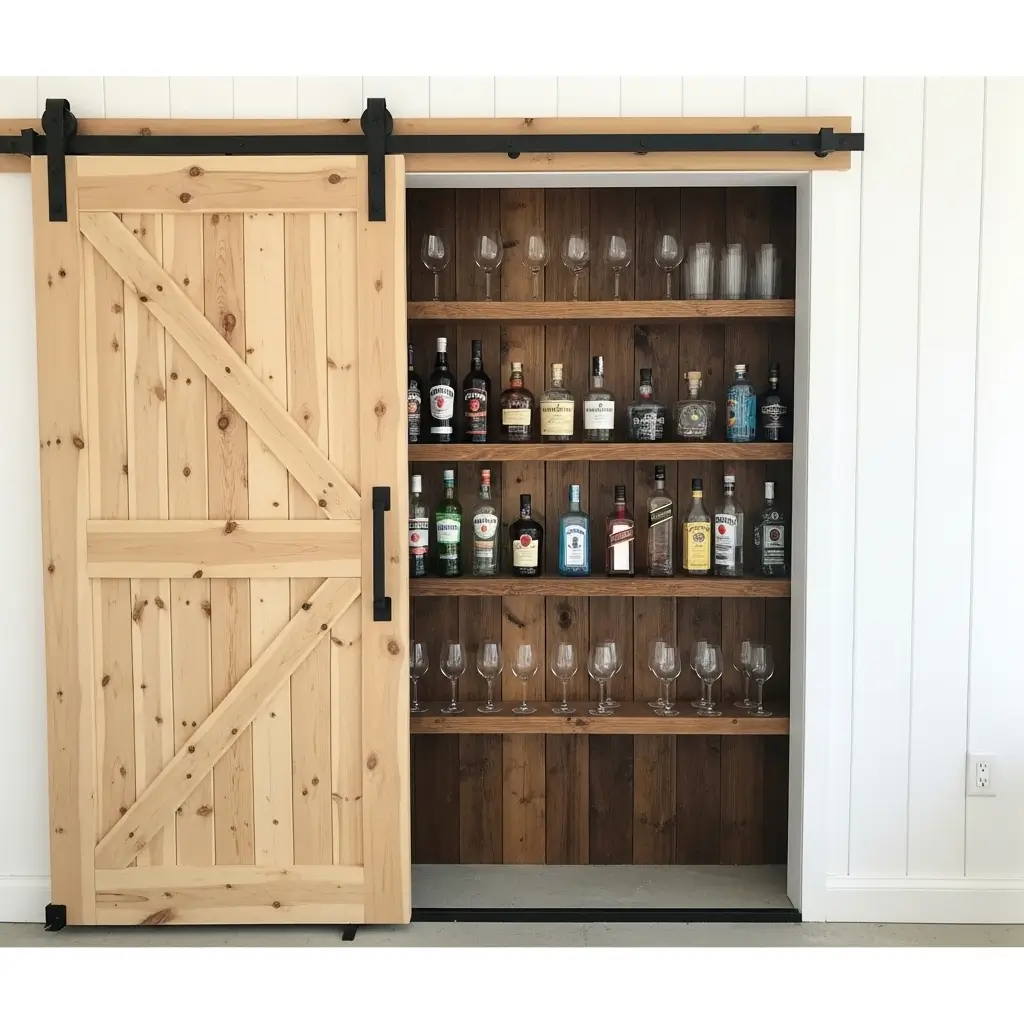 A sliding barn door can serve as a stunning backdrop for your bar shelves.