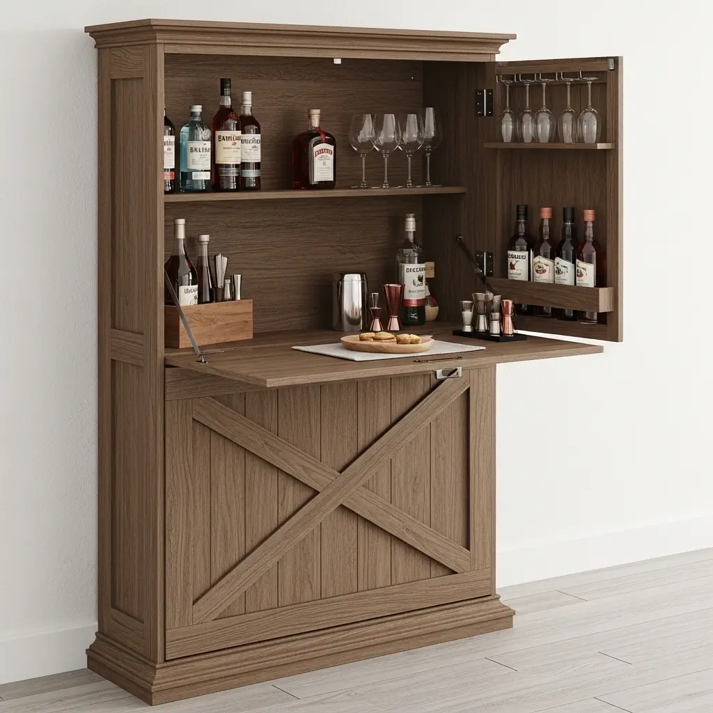 When closed, it looks like a decorative barn-door cabinet; when opened, the door drops down to create a sturdy serving surface.