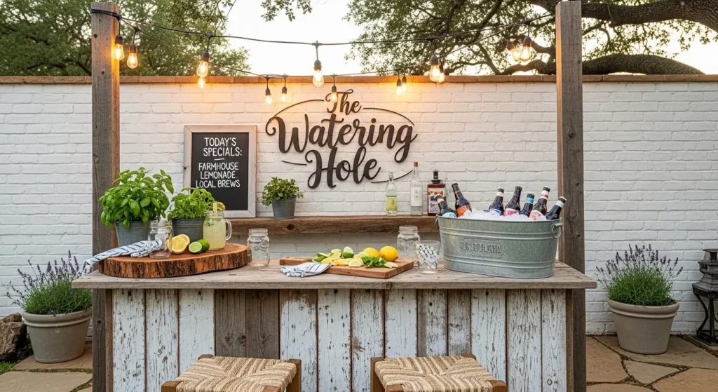 This setup pairs beautifully with vintage barstools and warm string lighting, creating an inviting atmosphere that feels both timeless and cozy for every summer gathering.