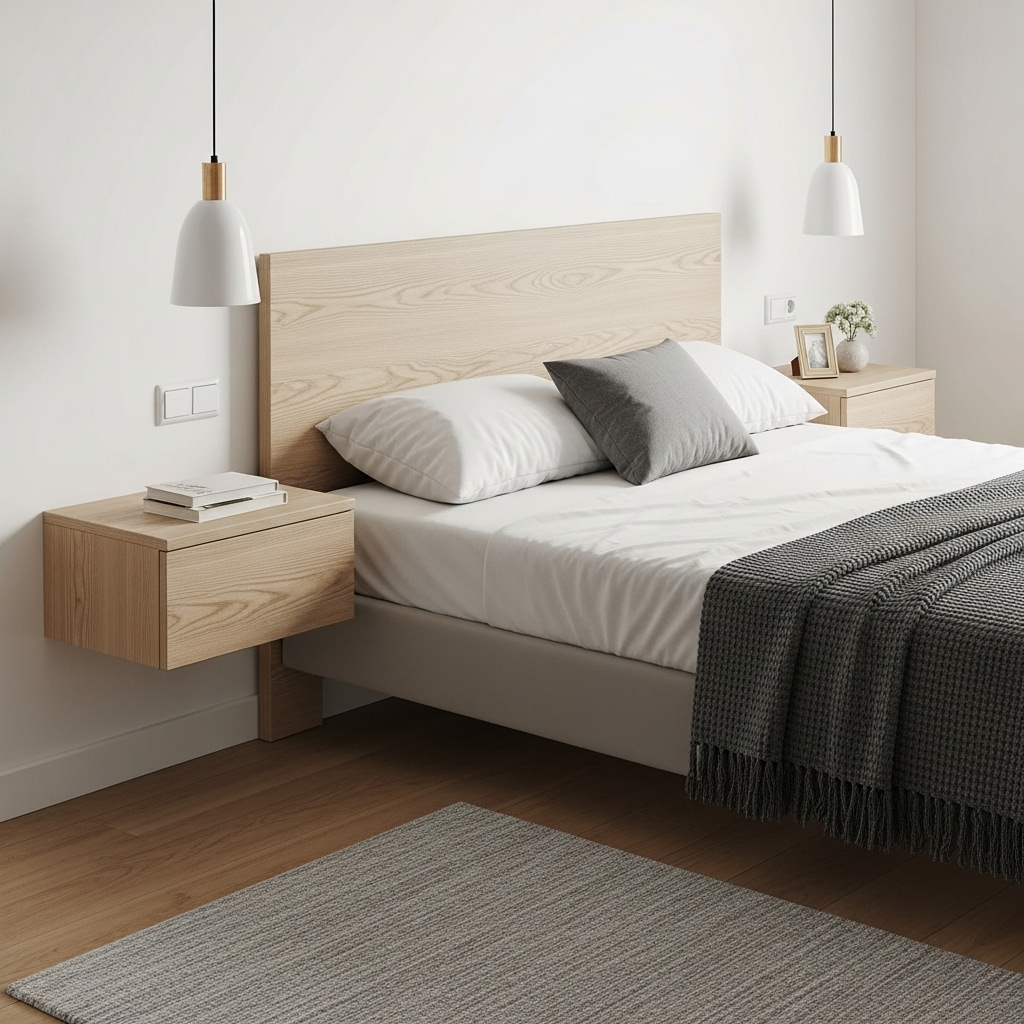 To enhance the feeling of spaciousness in a smaller bedroom, mount floating nightstands on the wall on either side of your bed. This layout trick keeps the floor visible and uncluttered, which is a hallmark of Japanese minimalism.