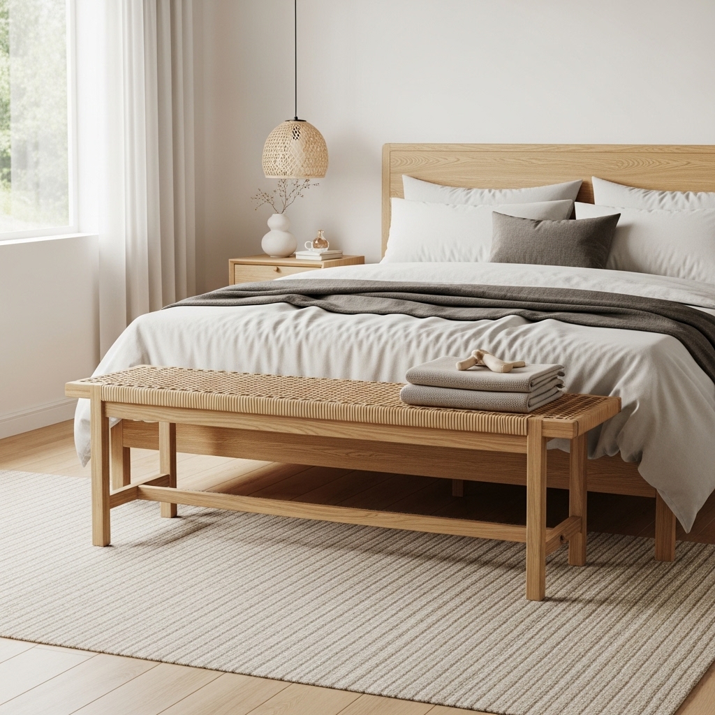 Anchor your sleeping space by placing a long, narrow bench at the foot of your bed. Choose a piece made of light oak or woven rattan to add texture without bulk.