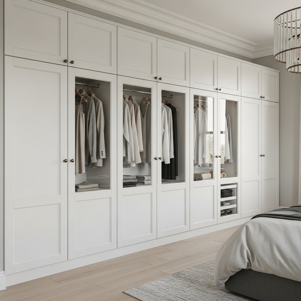 Built-in wardrobes or flat-fronted armoires painted the same color as the walls work best to disappear into the architecture. This layout strategy prevents visual noise by consolidating “heavy” items in one zone, leaving the rest of the room breathable.
