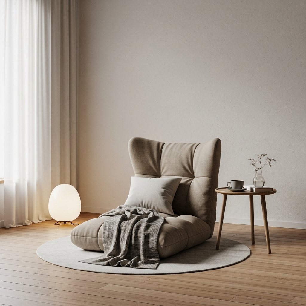 Pair it with a tiny, round side table for a cup of tea. This layout invites relaxation without adding visual height or bulk. It is an intimate arrangement that encourages curling up with a book, embodying the cozy comfort of hygge within a disciplined minimalist framework.