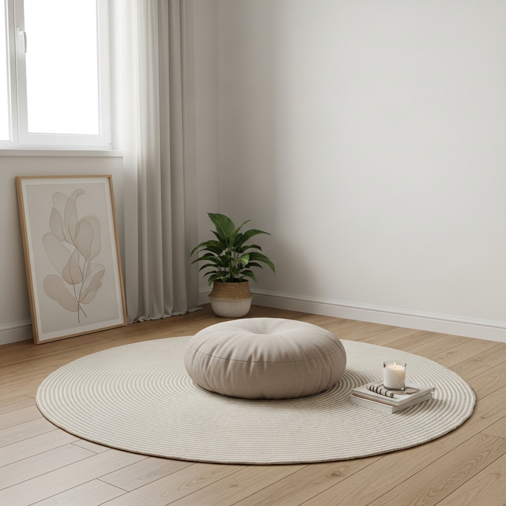 Dedicate a specific corner of the room solely to mindfulness by keeping it free of heavy furniture. Place a round tatami mat or a soft, neutral floor cushion in an empty corner, perhaps accompanied by a single low shelf for a candle or plant.