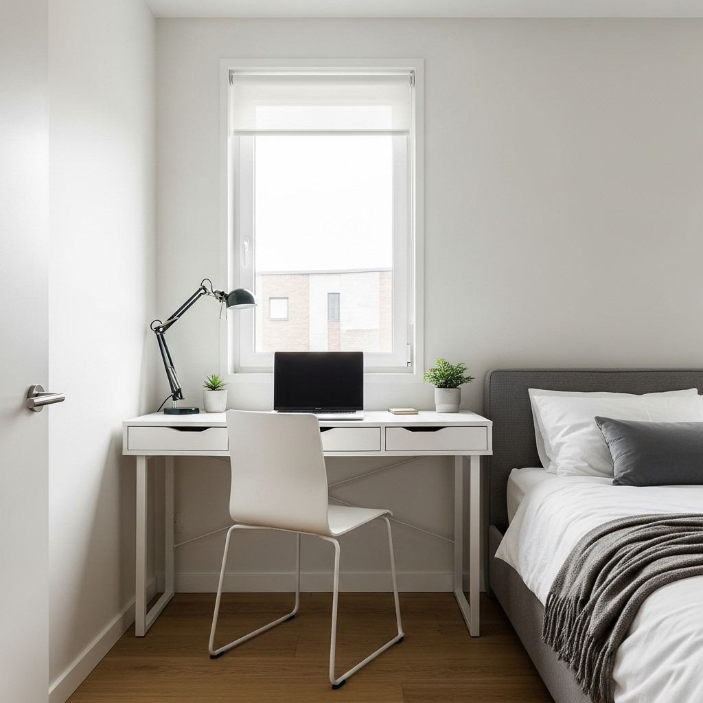 If you must work in your bedroom, position a slim, leggy desk against a wall, ideally facing away from the bed to mentally separate rest from work.