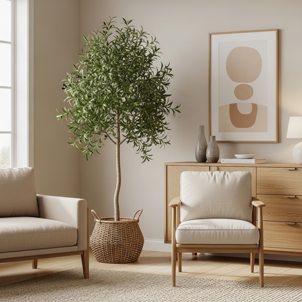 Soften the architectural lines of your furniture by dedicating a corner to a large, statement indoor plant. Place a tall potted tree, like a Ficus or Olive tree, in a woven basket next to a low armchair or dresser.