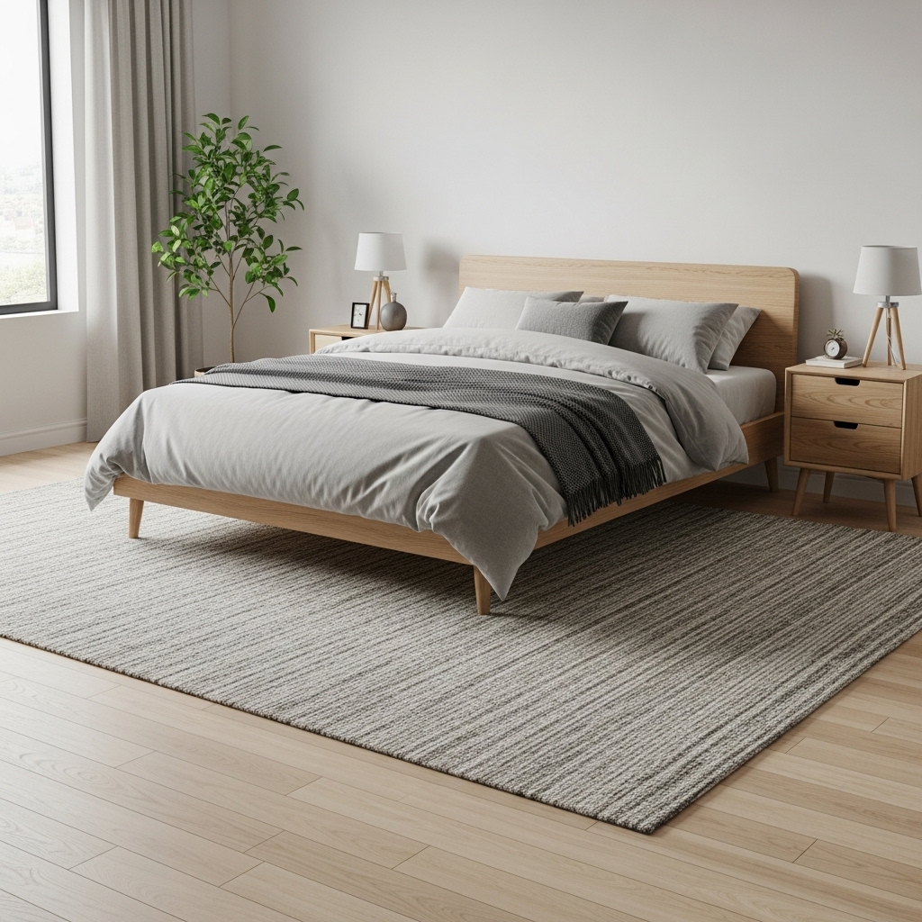 This adds a layer of Scandinavian coziness and warmth to the potentially cool Japanese minimalism. It visually groups the bed and nightstands together, anchoring them in the vastness of the room and providing a tactile comfort for bare feet in the morning.