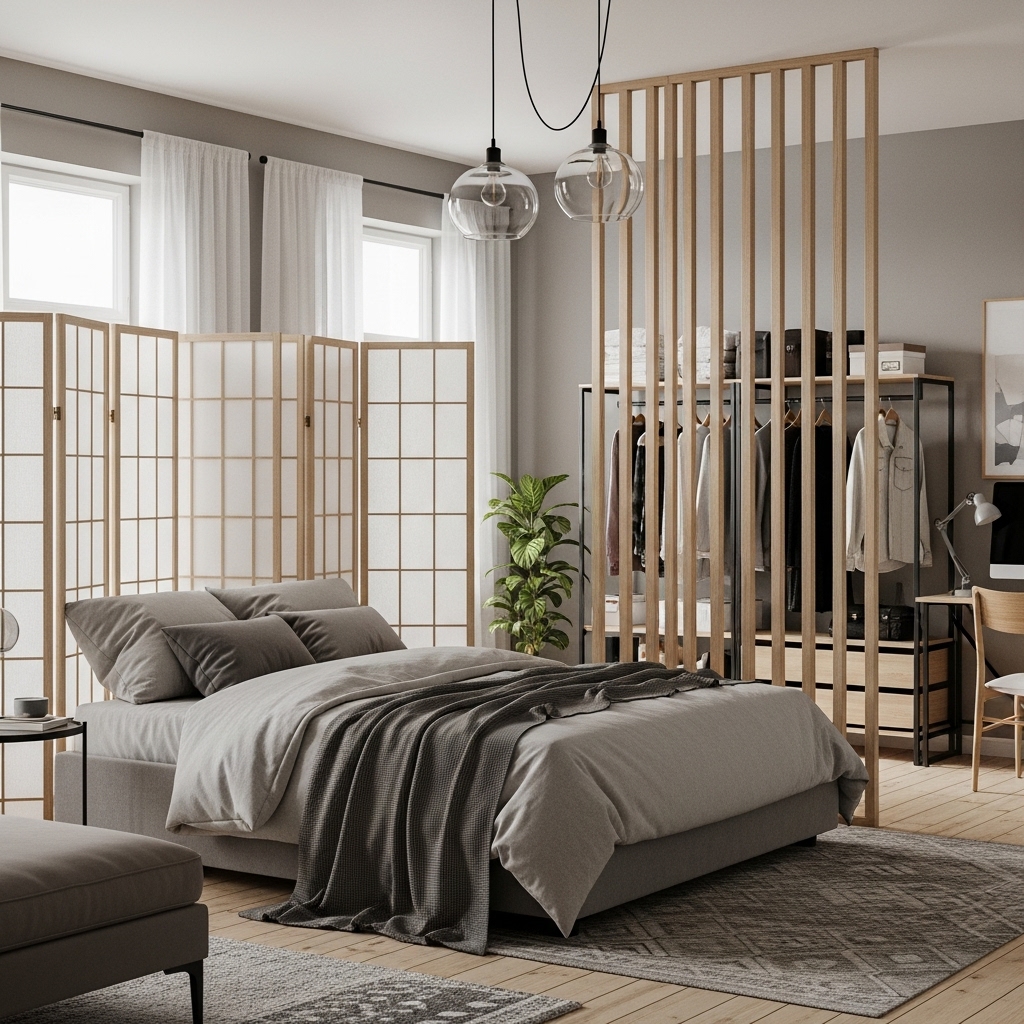 If you have a larger bedroom or a studio apartment, use a Shoji screen or a slat wood divider to zone your space without blocking light.