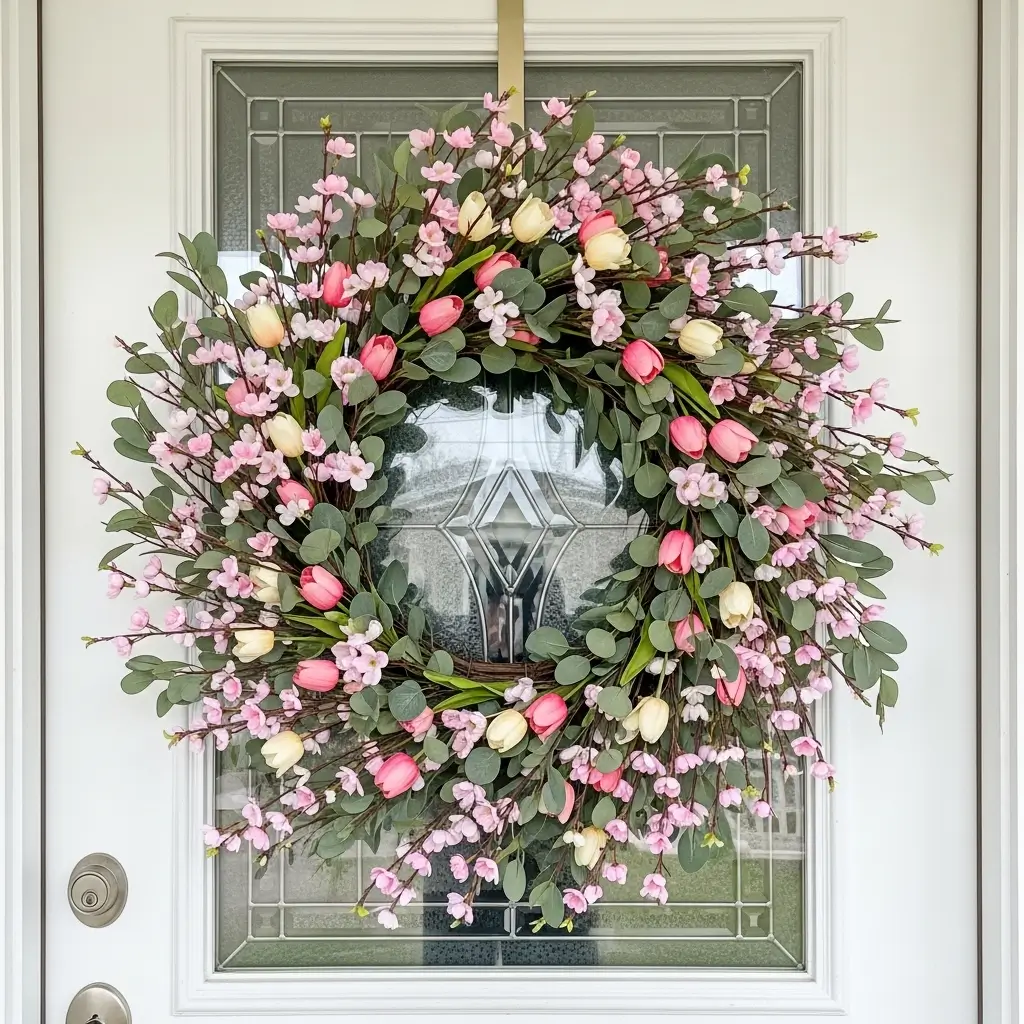 Opt for a wreath entirely constructed from faux blossoming cherry branches, delicate eucalyptus leaves, or vibrant faux tulips.