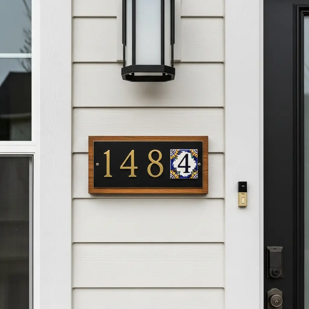 Consider elegant brass, sleek matte black, or even beautifully hand painted ceramic tiles for a uniquely customized look. Mount them prominently on a small wooden plaque or directly onto your house siding near the entryway.