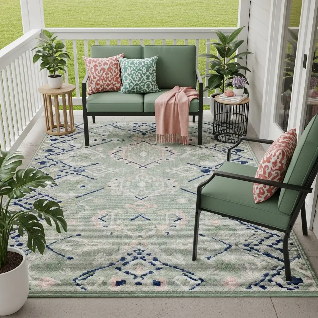 Choose a rug with a fun, breezy pattern in gorgeous spring hues like sage green, soft pink, or crisp navy blue. It effectively hides unappealing floor imperfections, adds a delightful layer of soft texture, and incredibly elevates the overall coziness of your outdoor living area effortlessly.