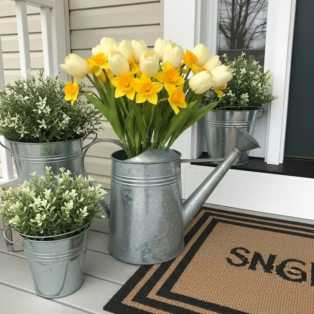 Consider using a classic galvanized metal watering can as an incredibly unique and striking vase for a large bunch of faux tulips or bright yellow daffodils.