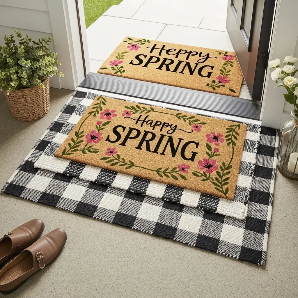 Then, place a standard coir mat on top featuring a cheerful spring greeting or a cute motif. This simple layering technique adds instant texture, beautiful color, and a wonderfully inviting touch to your doorway without taking up any valuable floor space.
