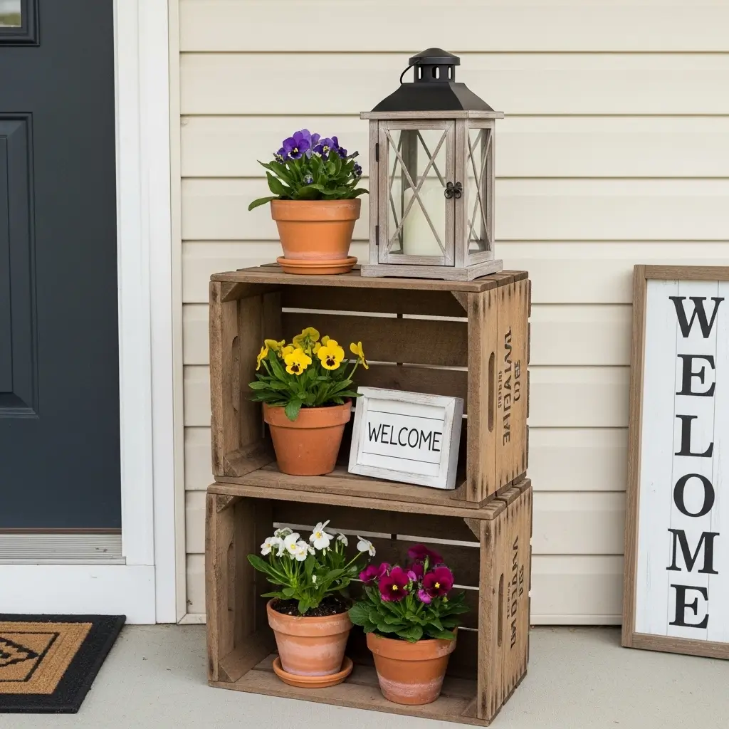Adding a touch of rustic charm is incredibly easy when you incorporate repurposed vintage wooden crates into your small porch decor. You can stack two sturdy crates vertically to create a wonderfully unique makeshift side table or a charming tiered plant stand.