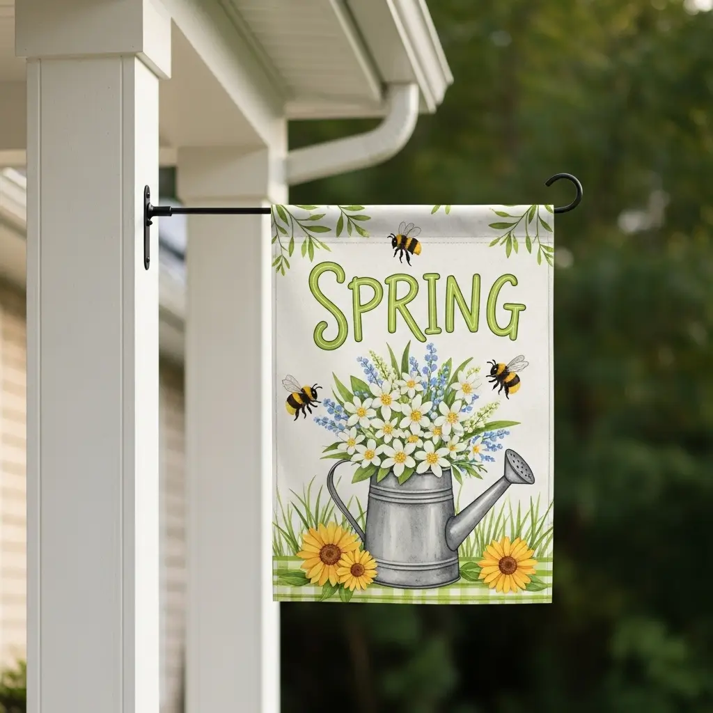 Mount a small flag bracket directly onto your exterior wall or the main porch column. Choose a flag that features cheerful springtime motifs like busy bumblebees, blooming watering cans, or beautifully illustrated floral bouquets.